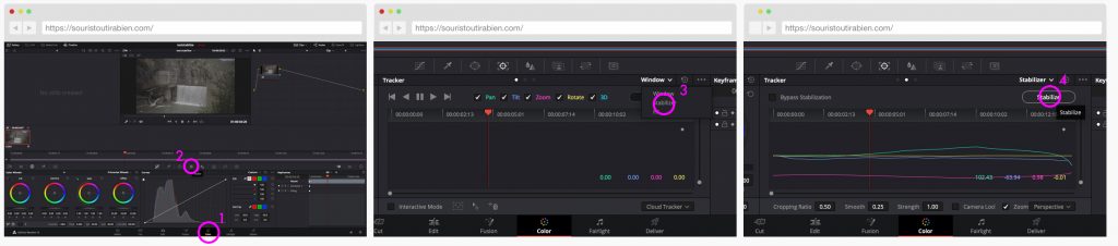 La stabilisation chez Davinci est un peu différente de celle de Premiere. Tout d’abord, il faut ouvrir l’onglet “color” puis l’option « tracker”,ensuite sélectionner l’option “stabilizer” et appuyer sur le bouton!