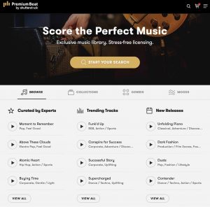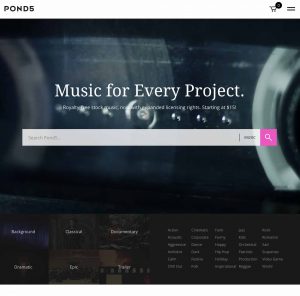 La version music royalty free de shuttlestock. Leur système de recherche est très optimisé, tu trouveras presque tout et d’une qualité professionnelle. Tu peux acheter une licence de chanson pour le prix standard de 49 $ (base web, en ligne, mariage et entreprise) ou une licence premium de 199 $ (TV-radio, cinéma, théâtre).