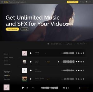Avec un choix de plus d’un demi-million de chansons, c’est un des leaders du marché. Ils proposent non seulement de la musique, mais aussi des séquences ou des templates After Effect. La licence d’une chanson te coûtera de 15 à 90€. Tu peux également opter pour un abonnement mensuel (195€) ou annuel (960€) pour télécharger ce dont tu as besoin, mais avec des limites car avec les abonnements tu n’as pas accès à toute leur bibliothèque musicale et tu as un nombre limité de téléchargements annuels.
